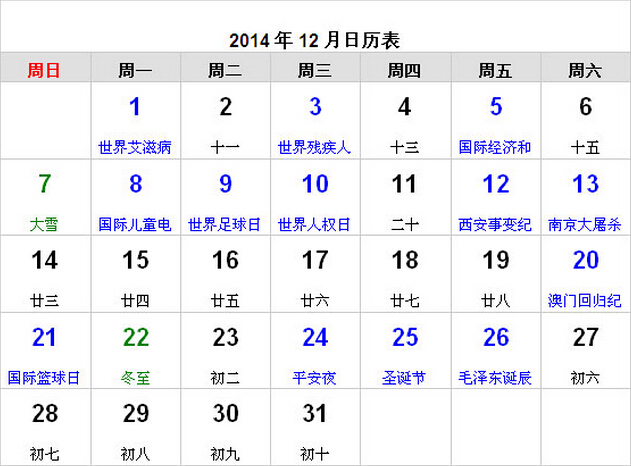 >> 2014年12月都有哪些节日纪念日日历表全览
