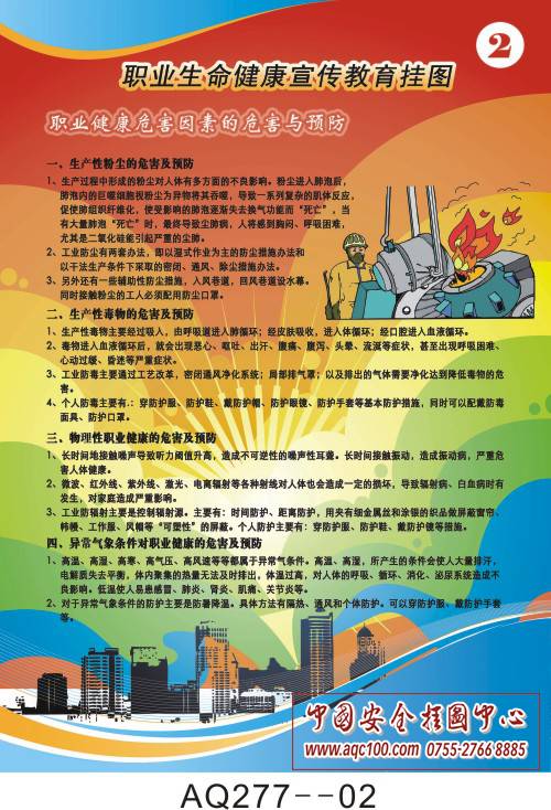 本套挂图主要内容包含:了解职业危害,远离职业病、职业性危害的主要因素、生产中可能存在的职业危害因素、生产性粉尘的职业危害与防护等方面的相关知识。通过本套挂图能够 -