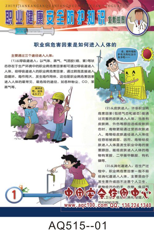 本套挂图主要内容包括:职业病危害因素进入人体的途径,职业健康体检的相关知识以及常见职业病的预防措施。语言通俗易懂,内容简洁实用,可视性强,方便学习掌握。是企业对 -