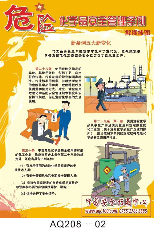 本套挂图是为了配合危险化学品安全生产管理的重点整治工作,介绍了新危险化学品的概念,并着重对新版《危险化学品安全管理条例》的几大特点做了详细的编写,配以卡通漫画生 -