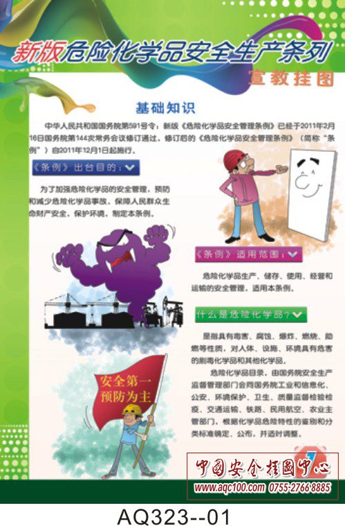 本套挂图是为了配合危险化学品安全生产管理的重点整治工作,介绍了危险化学品的概念,并着重对《危险化学品安全管理条例》的几大特点做了详细的编写,配以卡通漫画生动形象 -