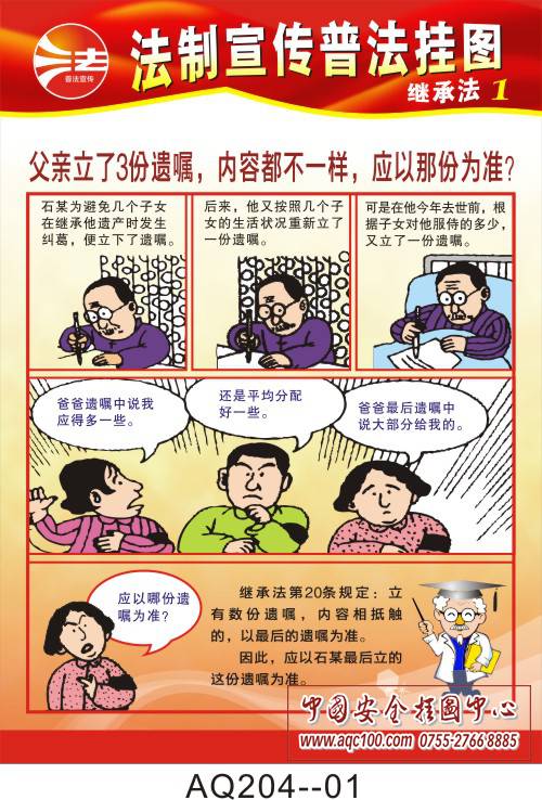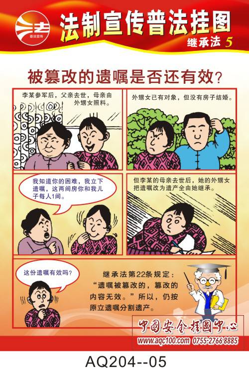 AQ204-01 父亲立了3份遗嘱,内容都不一样,应以那份为准? AQ204-02 丧偶儿媳可否继承婆婆遗产? AQ204-03 已作赠与处理的财物,是否可作为遗产分割? AQ204-04 舅舅是否有权变卖外甥女继承的遗产? AQ204-05 被篡改的遗嘱是否还有效?