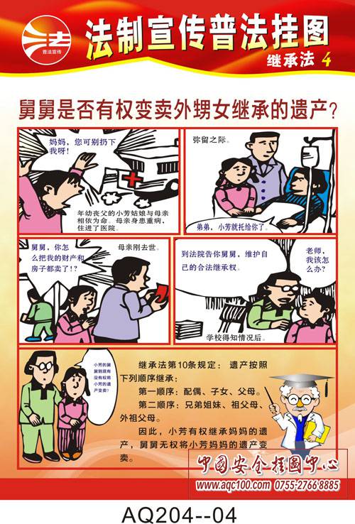 《中华人民共和国继承法》自一九八五年十月一日起施行。根据《中华人民共和国宪法》规定,为保护公民的私有财产的继承权,制定本法。继承从被继承人死亡时开始。本套挂图通过漫画的形式展示继承法的相关知识,通俗易懂,是宣传法制知识的首选