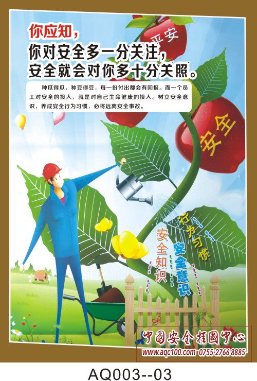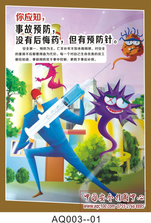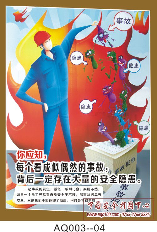 本套安全事故预防主题挂图最大特色在于将平时员工懵懵懂懂、甚至产生曲解的安全理念,凝结成最精悍的语言,环环相扣,层层递进,句句箴言。本套安全预防主题招贴旨在激发员工对安全生产更深刻的认真,更积极的渴望,从而自觉遵章守纪,养成良好的安全行为习惯。