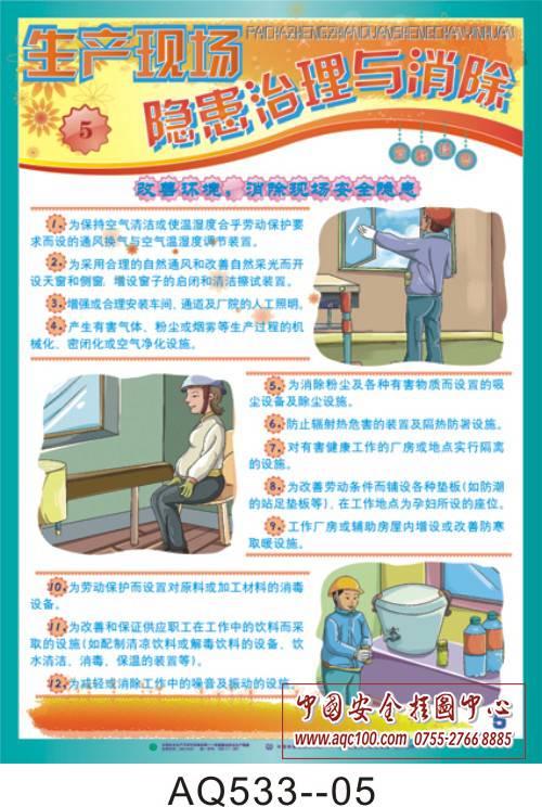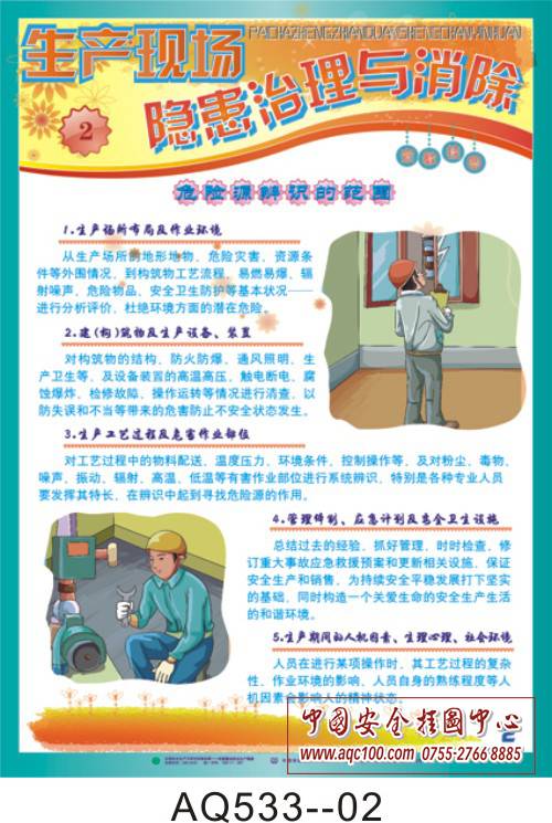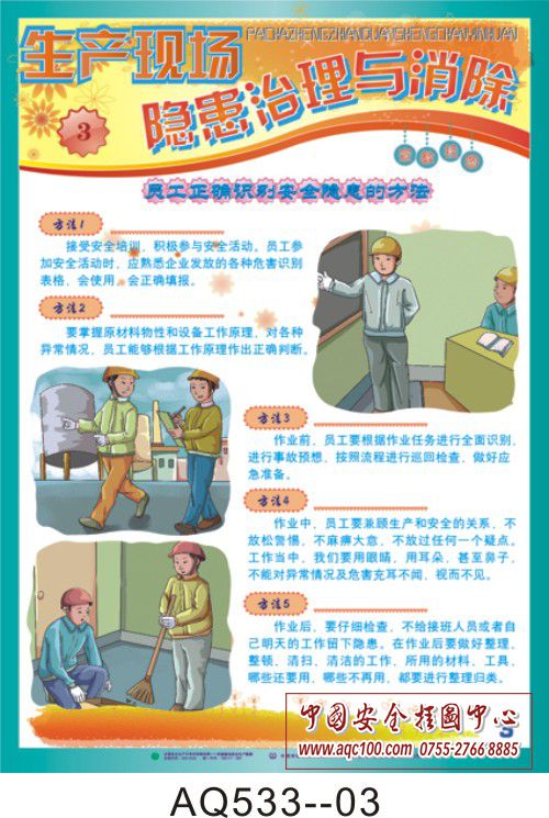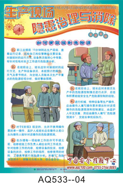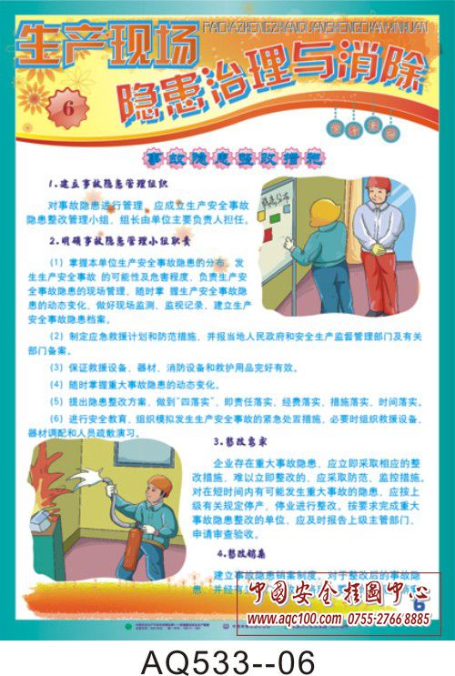 AQ533-01加强隐患排查治理挂图 隐患排查技术分析 AQ533-02加强隐患排查治理挂图 危险源辨识的范围 AQ533-03加强隐患排查治理挂图 员工正确识别安全隐患的方法 AQ533-04加强隐患排查治理挂图 如何有效控制危险源 AQ533-05加强隐患排查治理挂图 改善环境,消除现场安全隐患 AQ533-06加强隐患排查治理挂图 事故隐患整改措施