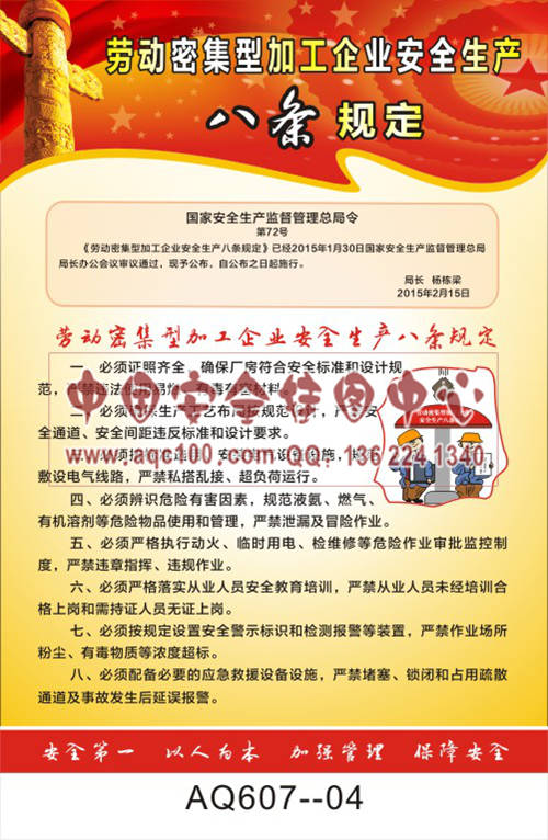 AQ607-04国家安全生产监督管理总局令宣传挂图 劳动密集型加工企业安全生产八条规定