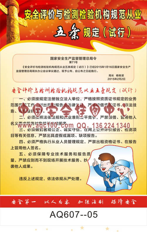 AQ607-05国家安全生产监督管理总局令宣传挂图 安全评价与检测检验机构规范从业五条规定(试行)