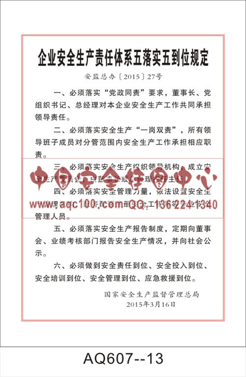 AQ607-13国家安全生产监督管理总局令宣传挂图 企业安全生产责任体系五落实五到位规定 白底黑字版