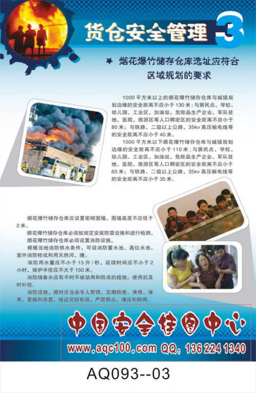 产品简介:本套挂图针对各种企业仓库作业环境的实际情况,整理出仓库安全防火责任制、仓库安全管理的主要任务、仓库单位的职责、烟花爆竹储存仓库选址应符合区域规划的要求、仓库安全工作管理制度、仓库安全管理制度、仓库保管员岗位职责的项安全要求,并详细说明了科学防治方法,是不可多得的安全生产科普宣传用品。