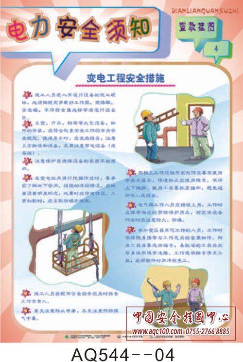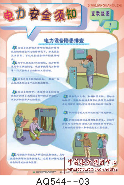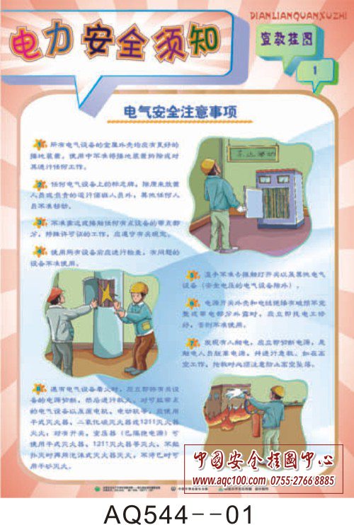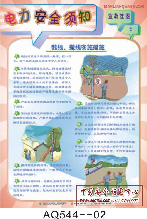 AQ544-01电力安全须知宣教挂图 电气安全注意事项 AQ544-02电力安全须知宣教挂图 敷线、扯线实施措施 AQ544-03电力安全须知宣教挂图 电力设备隐患排查 AQ544-04电力安全须知宣教挂图 变电工程安全措施 AQ544-05电力安全须知宣教挂图 电力行业违章行为 AQ544-06电力安全须知宣教挂图 提高电力行业安全意识