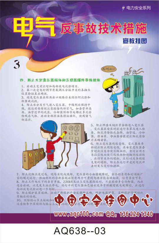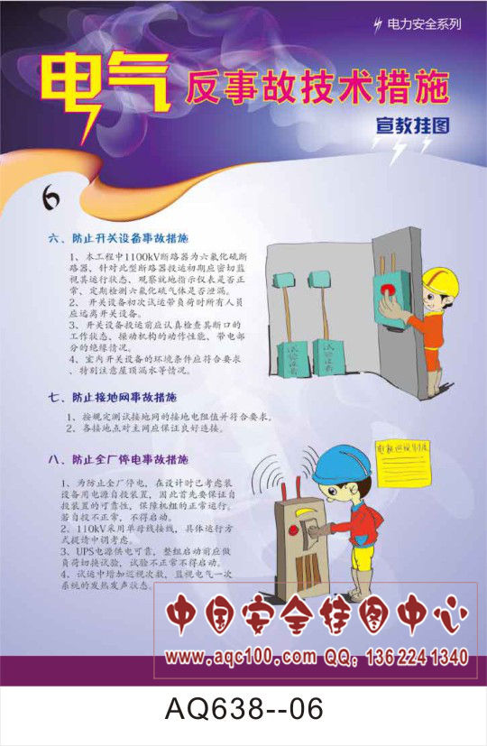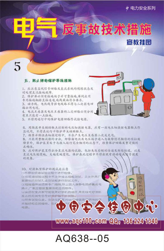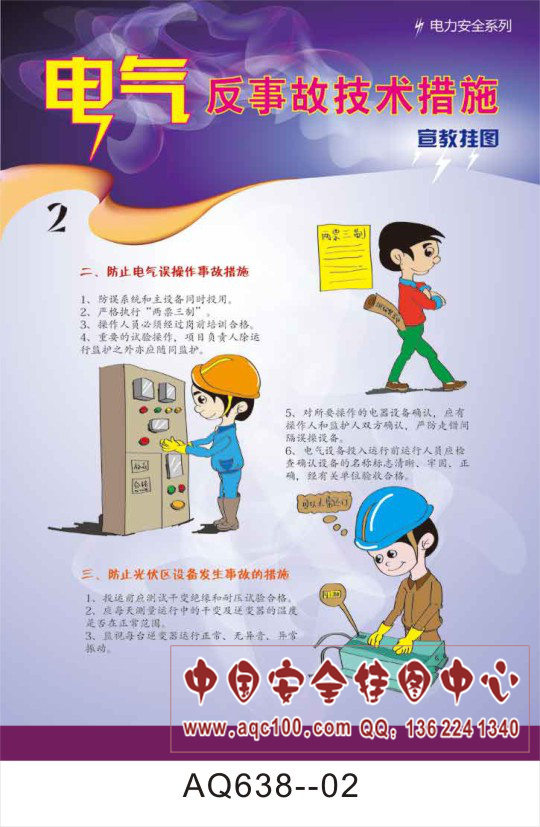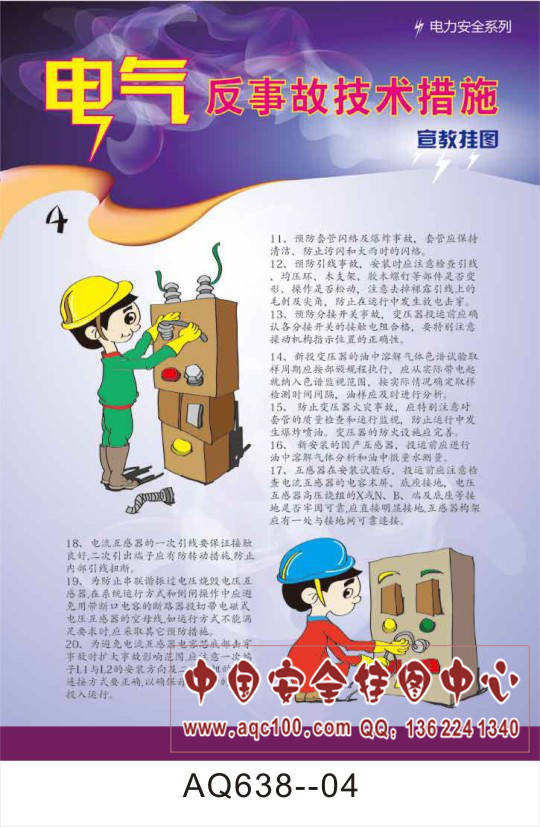 电气反事故技术措施挂图涵盖了防止电气人身伤亡事故措施;防止电气误操作事故措施;防止光伏区设备发生事故的措施;防止大型变压器损坏;防止互感器爆炸事故措施;防止继电保护事故措施等,内容可以使员工快速掌握防范电力事故和紧急处理的方法及流程,从而减少事故发生的可能。