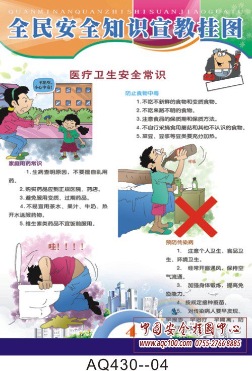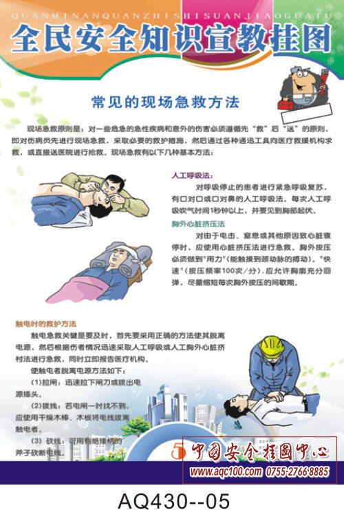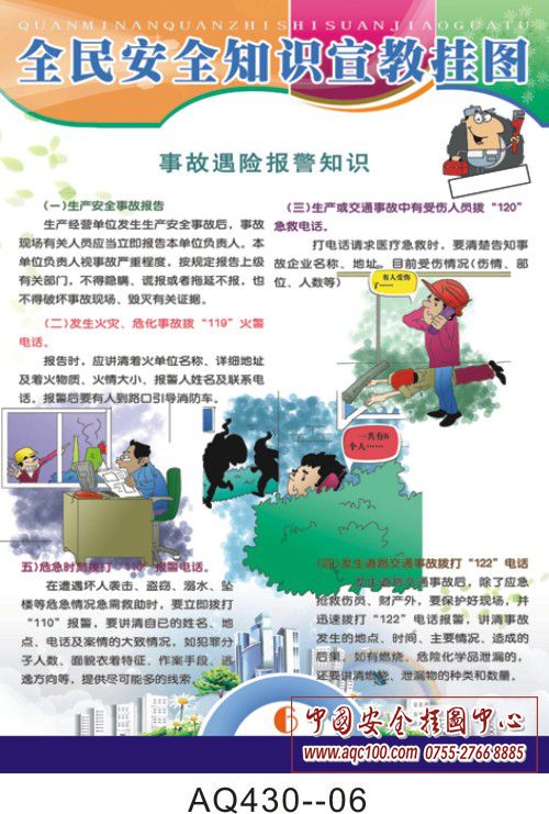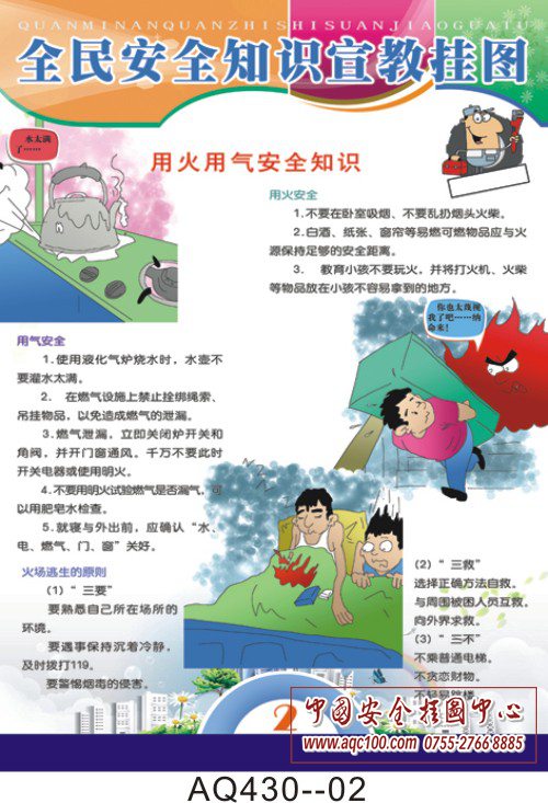 为了普及全民安全知识,提高全民安全意识的能力,特编制全民安全知识挂图一套。该挂图强调珍爱生命、用火用气安全、用电、交通安全、医疗卫生安全,并介绍了 常见的现场急救方法及事故遇险时的报警知识。挂图知识性强,是落实“以人为本”的科学发展观、构建社会主义和谐社会的需要,是普及全民安全知识的首选。 AQ430--全民安全知识挂图-6张
