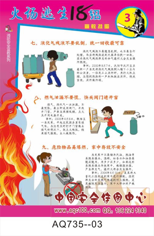 AQ735-03火场逃生18招宣传挂图 液化气残液不要乱倒,统一回收最可靠