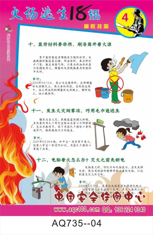AQ735-04火场逃生18招宣传挂图 装修材料要非燃,刷漆离开着火源