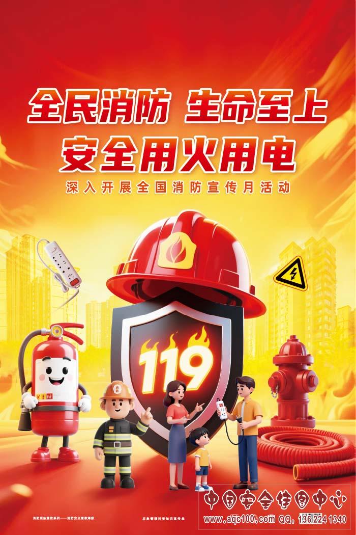 今年11月9日是第34个全国消防日。国务院安委会办公室、国家消防救援局定于11月份在全国开展消防宣传月活动,主题是“全民消防、生命至上——安全用火用电”。2025年消防月主题宣教海报(大版)