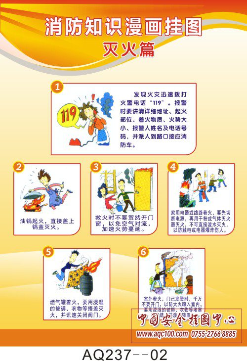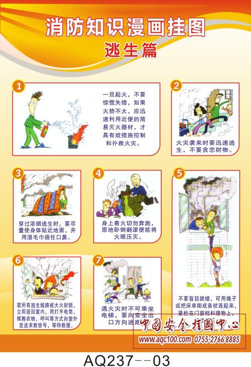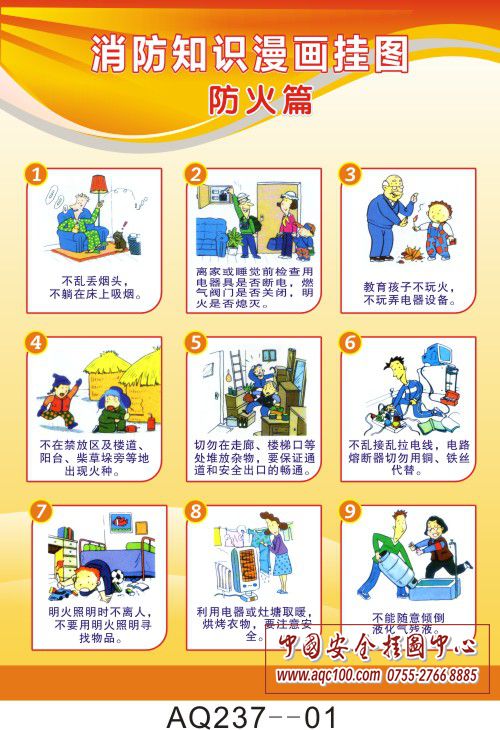 该挂图内容是消防方面的常识,有防火篇、灭火篇、逃生篇、消防标志篇等图文搭配,布局合理,文字重点清晰,图画生动传神,使人一目了然,便于记忆,易于操作。适合公共场所、学校、企事业单位的进行消防安全工作的宣传教育。