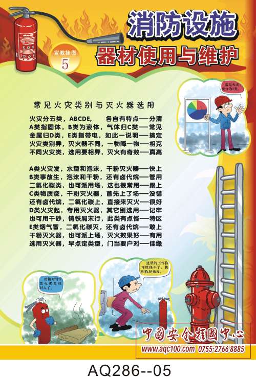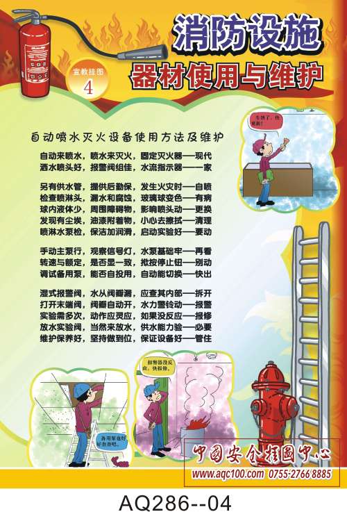 本套挂图以简洁诗歌的方式对室内(外)消防栓(箱)的使用方法与维护、火灾自动报警设备的使用方法及维护、自动喷水灭火设备用方法及维护、常见火灾类别与灭火器选用、常用灭火器使用方法等介绍消防设施器材相关知识,生动的呈现在读者的面前,是企事业单位集中进行消防安全教育的重要选择。