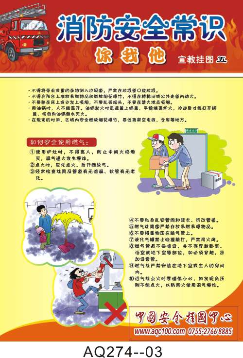 本套消防安全常识你我他挂图内容包括常用手提式灭火器的使用方法及灭火器爆炸、消防救火不收费、如何安全使用燃气、火场逃生十大秘诀、安全用电须知等,有较强针对性,内容精准,形式活泼,漫画的设计增强了娱乐性。为企业宣传消防安全教育打造良好的舆论氛围。
