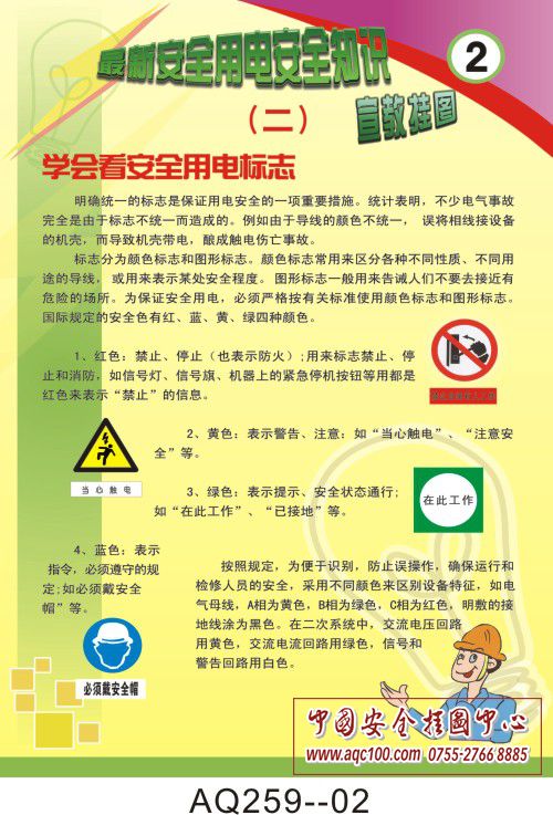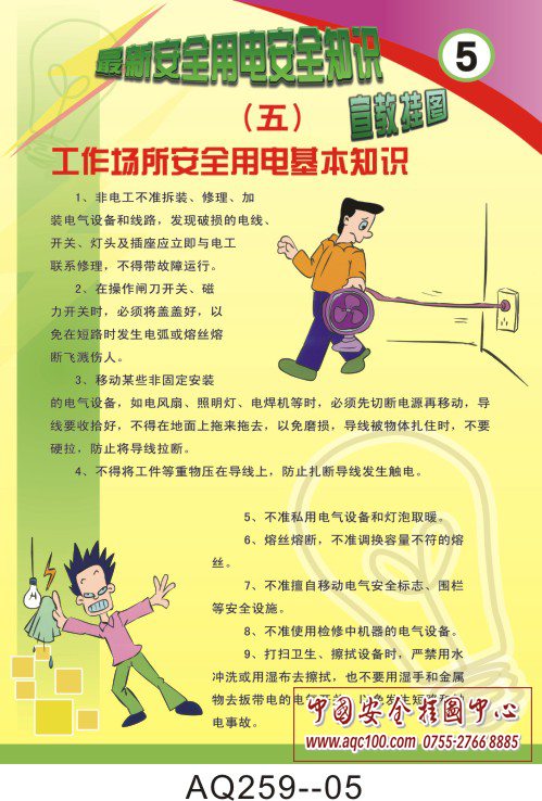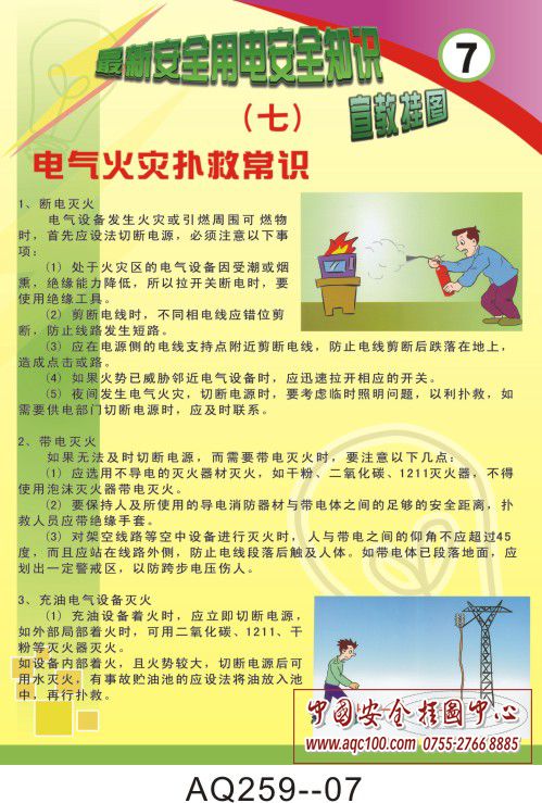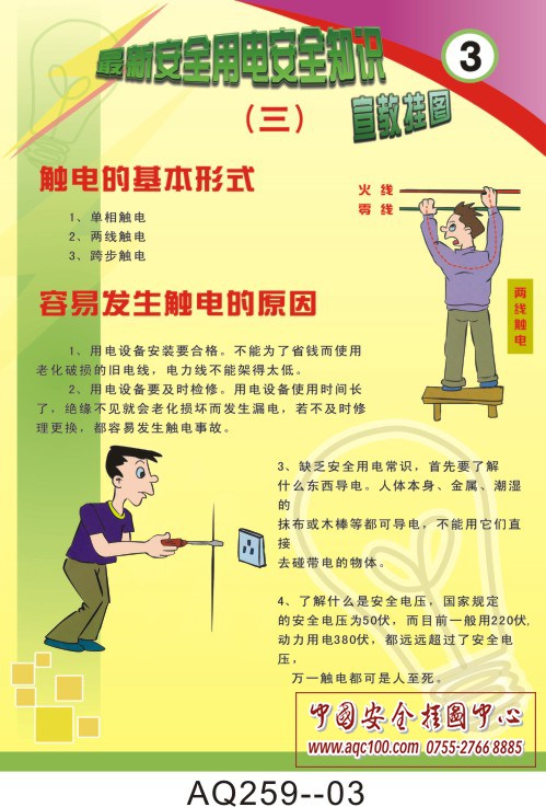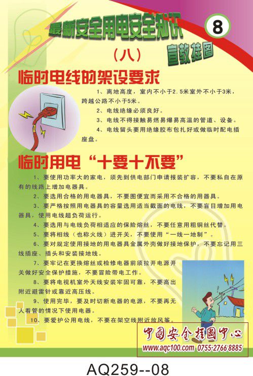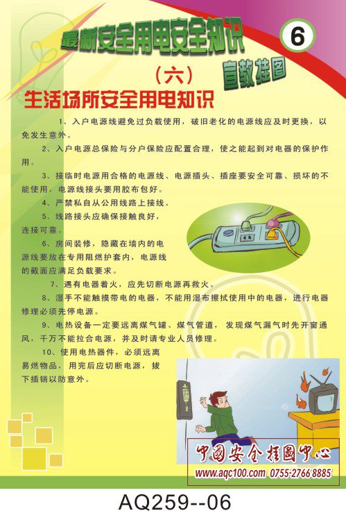 本套挂图主要介绍最新用电安全知识,内容包括:电的危险性、会看安全用电标志;触电的基本形式、容易发生触电的基本原因;正确处置触电人员六注意;各种作业场所安全用电基本知识;生活场所安全用电知识;电气火灾扑救常识;临时电缆的架设要求、安全用电“十要十不要”等。