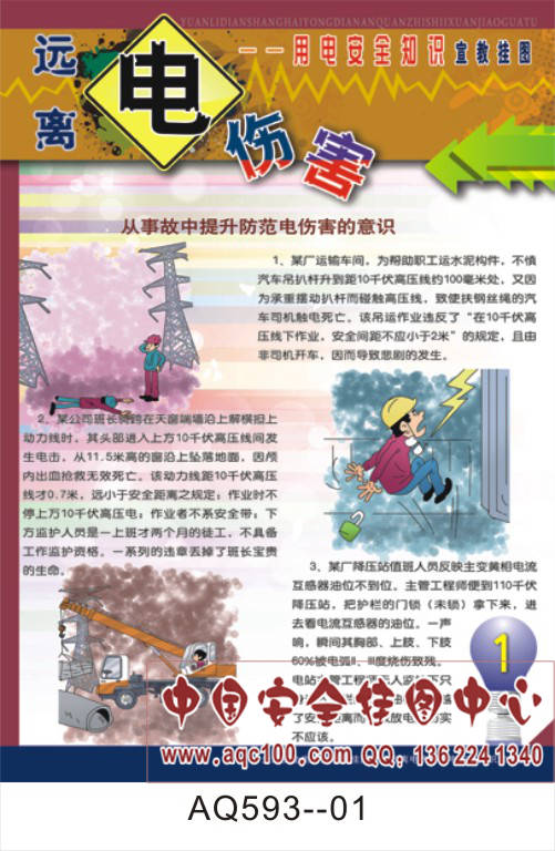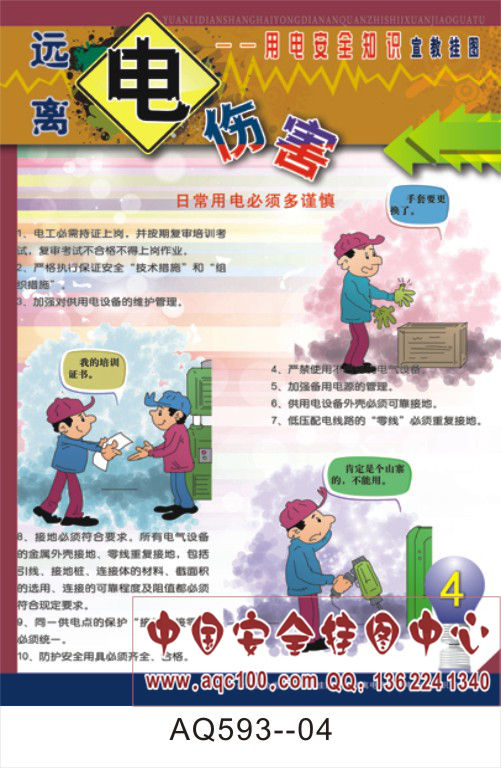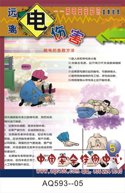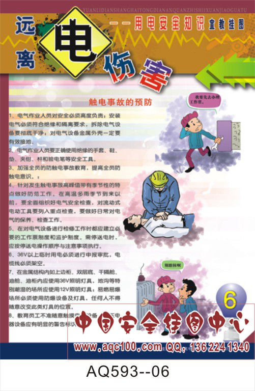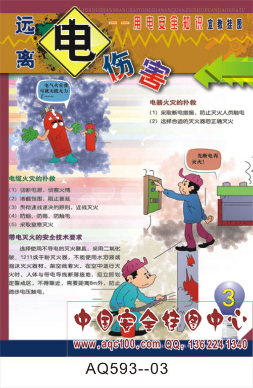 本套挂图主要介绍了:用电安全事故发生原因及特点、电器火灾的扑救、触电的急救方法、触电事故的预防等方面的相关知识,内容全面系统,是企事业单位和团体对员工进行用电安全教育的必备教材。 AQ593--远离电伤害用电安全知识宣传挂图-6张
