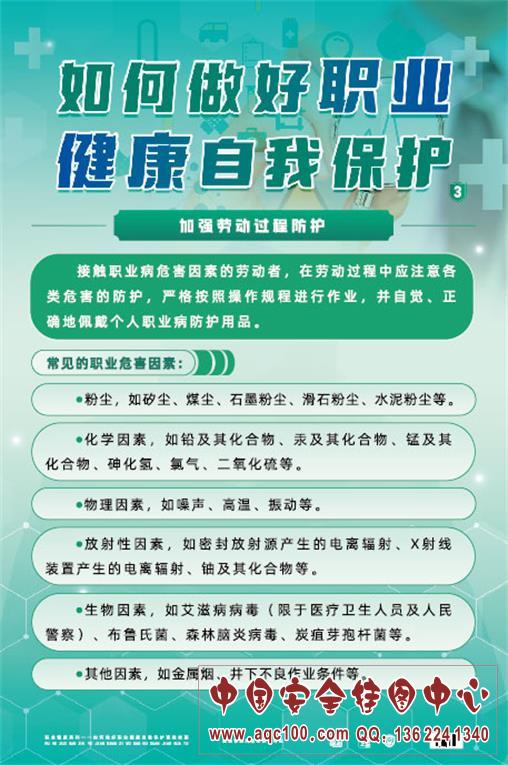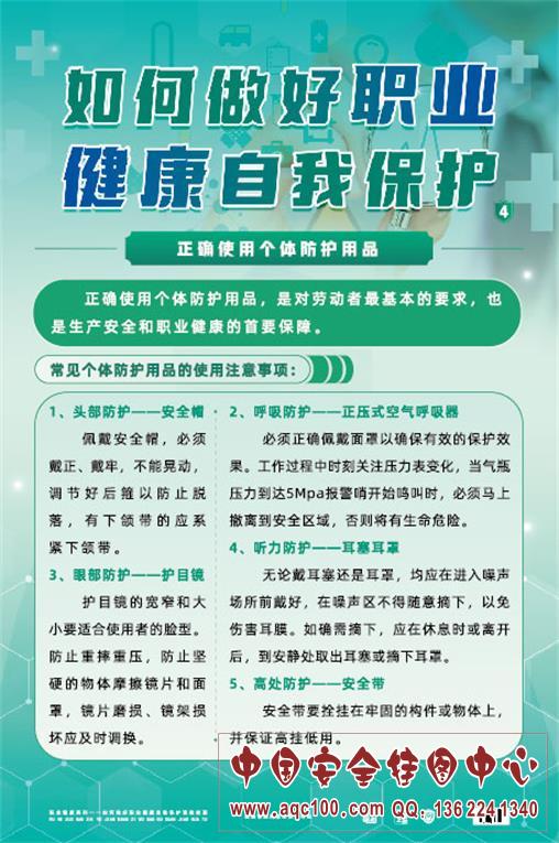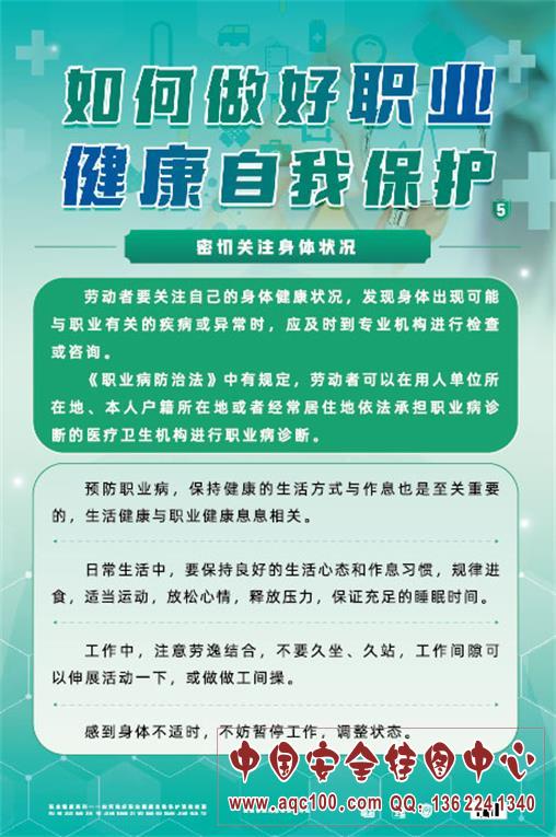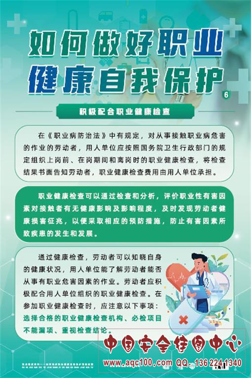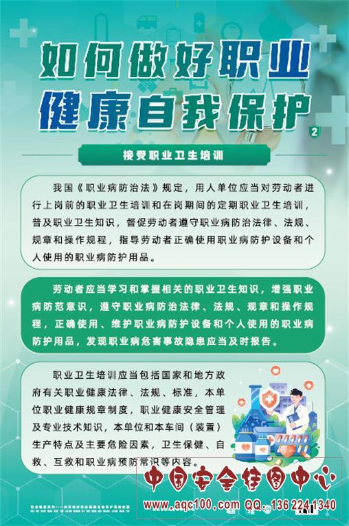 ZAG0182 如何做好职业健康自我保护宣教挂图 本挂图以普通员工的角度出发,介绍了如何在日常工作和生活中做好职业健康自我保护:接受职业卫生培训、正确科学地进行自我防护、参加职业健康检查。适合相关部门、企业在职业病宣传周张贴,增加活动气氛,或进行日常学习,为开展职业病防治工作添砖加瓦。