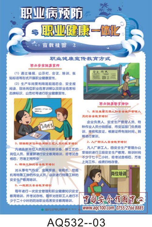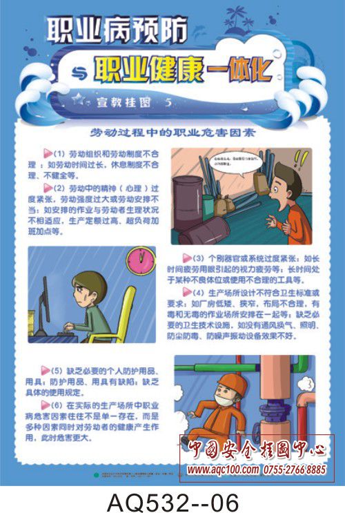 通过简明扼要的语言和生动有趣的画面,挂图将生产经营过程中常见职业危害表现出来,并且针对控制职业危害、开展专项督查给出了建议,并且加入了公众关心的雾霾治理相关内容,员工喜闻乐见,适合生产经营单位开展职业病防治普及宣传工作使用。