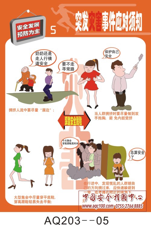 突发灾害事件应对须知:本套挂图用了通俗易懂的语句,图文并茂详细介绍了:在日常生活中应急准备常识、火灾应对常见错误、人员应急常见错误、遭遇水灾该怎么样逃生、踩踏安全脱险、地震时自救四大常识。本挂图适用于在厂房、车间、办公室、橱窗内张贴宣传,供企业员工学习掌握。