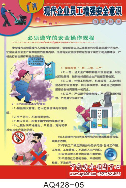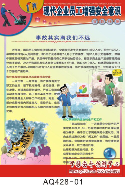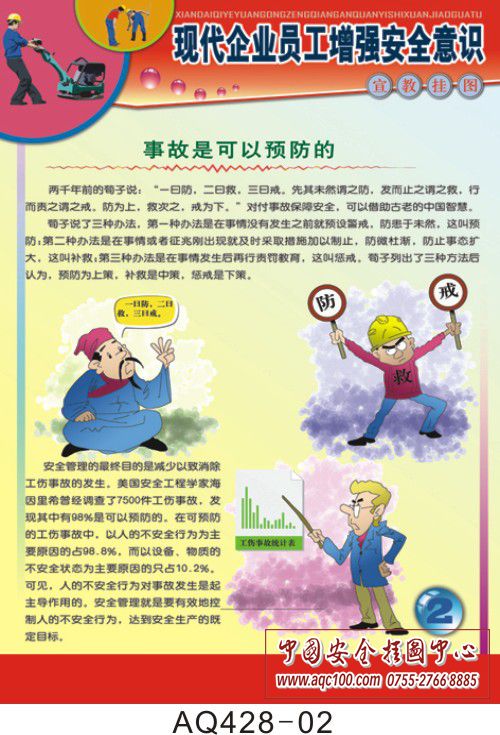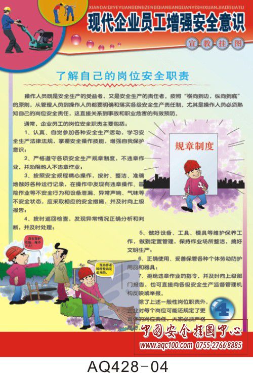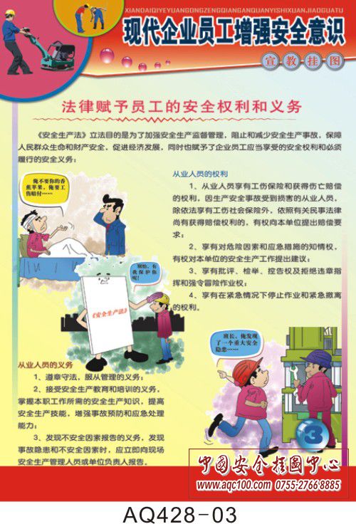 本套挂图经典的引用了两千年前的荀子说:“一日防,二日救,三日戒”。对付事故保障安全,可以借助古老的中国智慧。讲述了法律赋予员工的安全权利和义务,了解自己的岗位安全职责,遵守安全操作规程,我们的重要保障是安全使用用品。