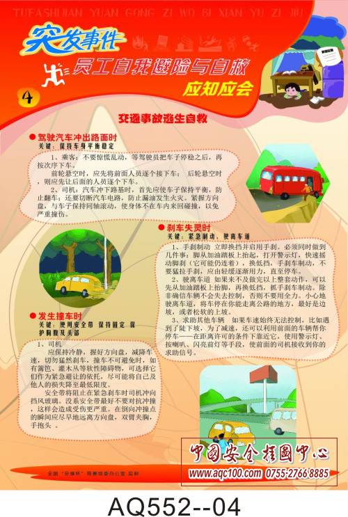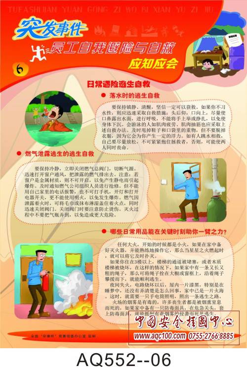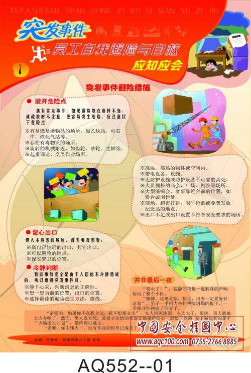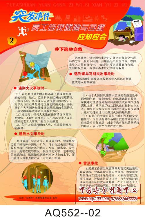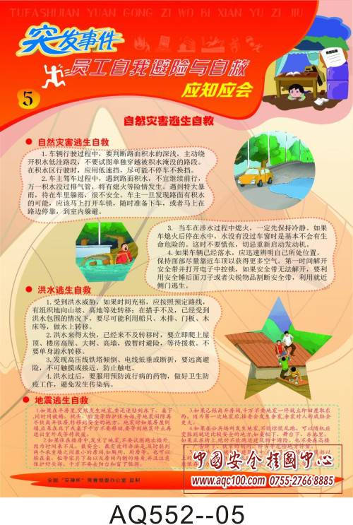 AQ552-01突发事件员工自我避险与自救应知应会挂图 突发事件避险措施 AQ552-02突发事件员工自我避险与自救应知应会挂图 井下逃生自救 AQ552-03突发事件员工自我避险与自救应知应会挂图 火场逃生自救 AQ552-04突发事件员工自我避险与自救应知应会挂图 交通事故逃生自救 AQ552-05突发事件员工自我避险与自救应知应会挂图 自然灾害逃生自救