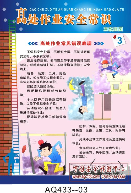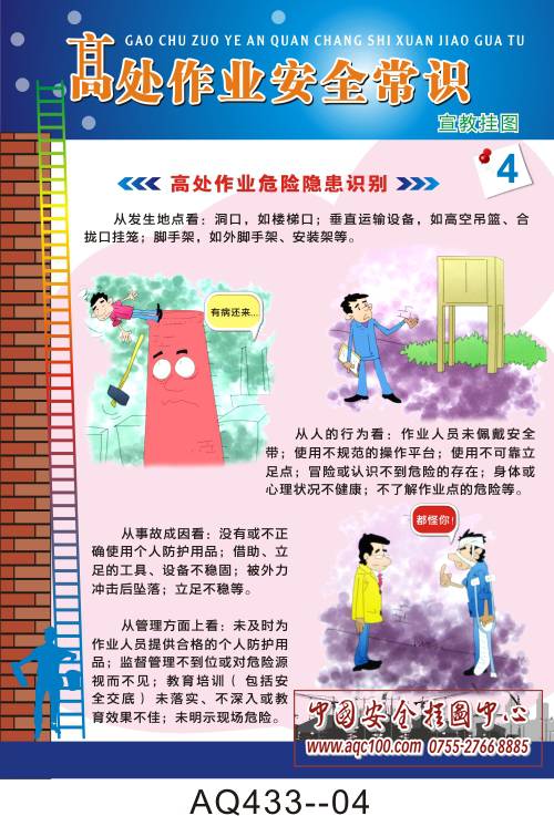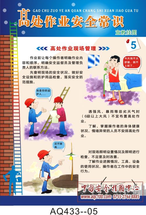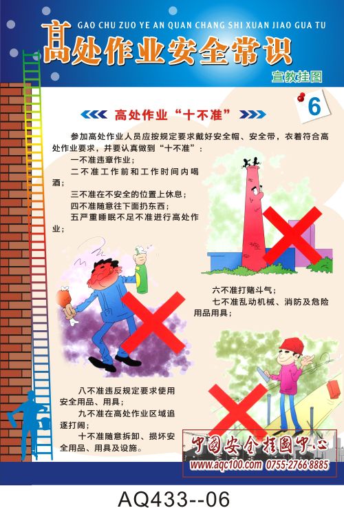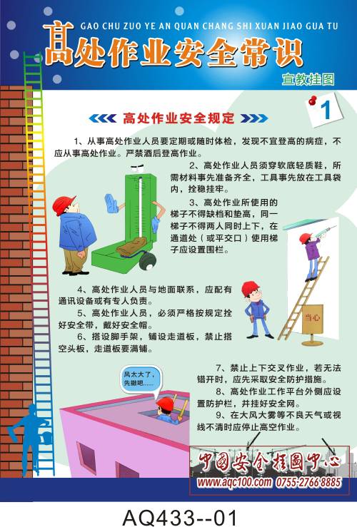 本套挂图以高处作业安全常识为主,配有生动的插图,提醒人们高处作业安全注意事项,幽默的漫画展现方式,轻松活泼营造企业安全氛围,使刻板的工作环境顿时变得轻松、充满活力、有生机,起很好的宣传激励作用,是需要进行高处作业的个人、企事业单位和生产企业的极好学习资料。