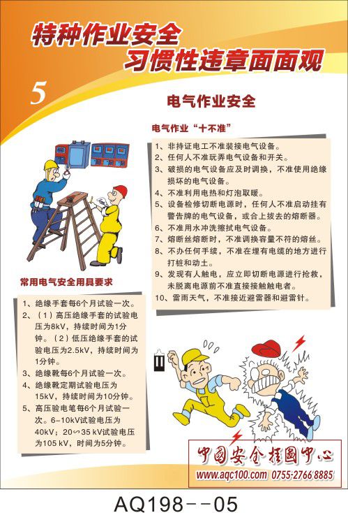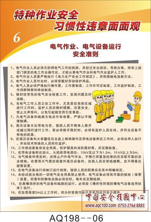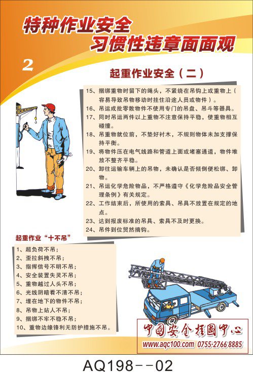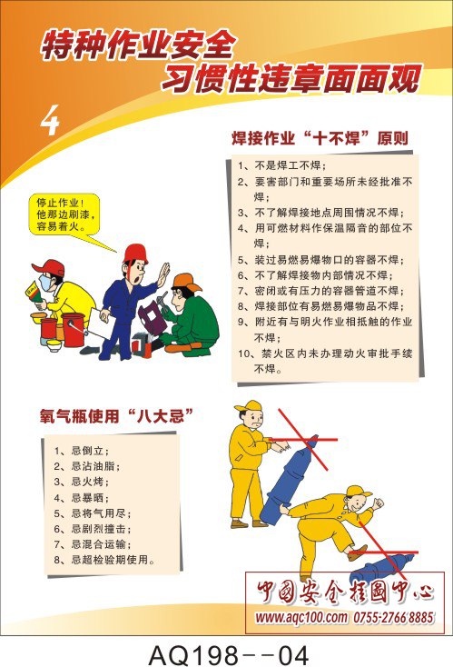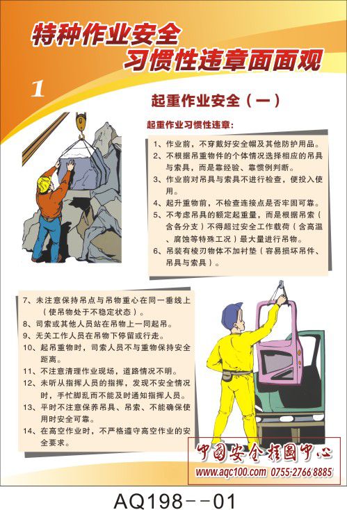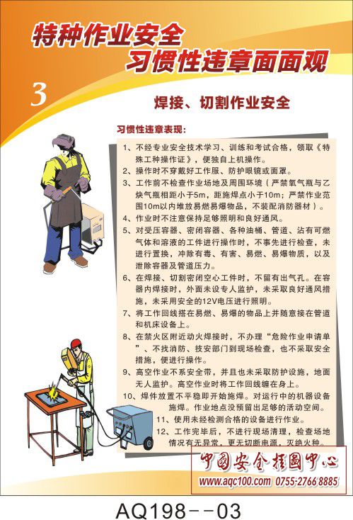 特种作业安全挂图全面详细地介绍了特种作业安全中的习惯性违章,内容深入浅出,通俗易懂,图文并茂,明确习惯性违章作业对安全生产的危害极大,有利于企业员工对自身习惯性违章作业的纠正,有利于企业的安全生产和发展,突出了本年度安全生产宣传月活动的安全生产宣传主题。