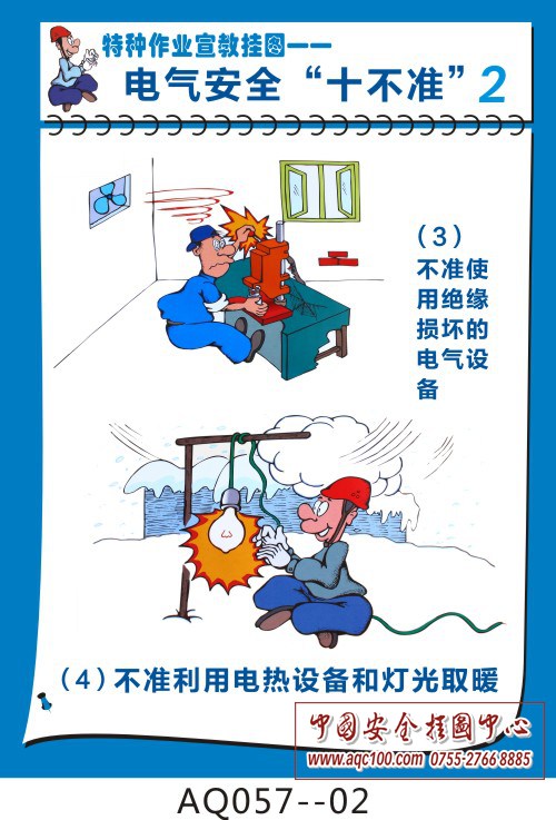 AQ057-02 不准使用绝缘损坏的电气设,不准利用电热设备和灯光取暖