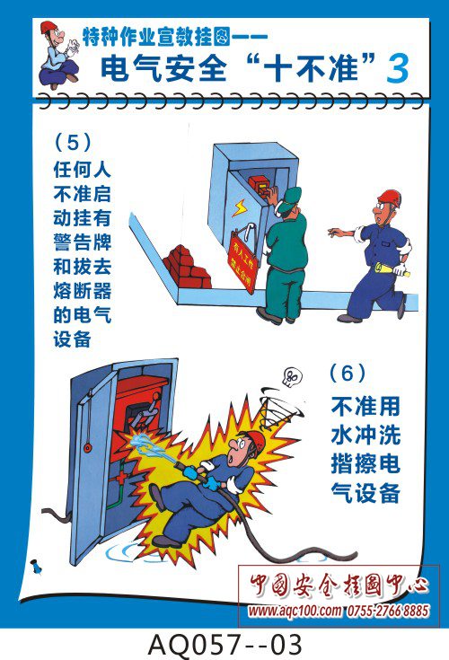 AQ057-03 任何人不准启动挂有警告牌和拔去熔断器的电气设备,不准用水冲洗揩擦电气设备