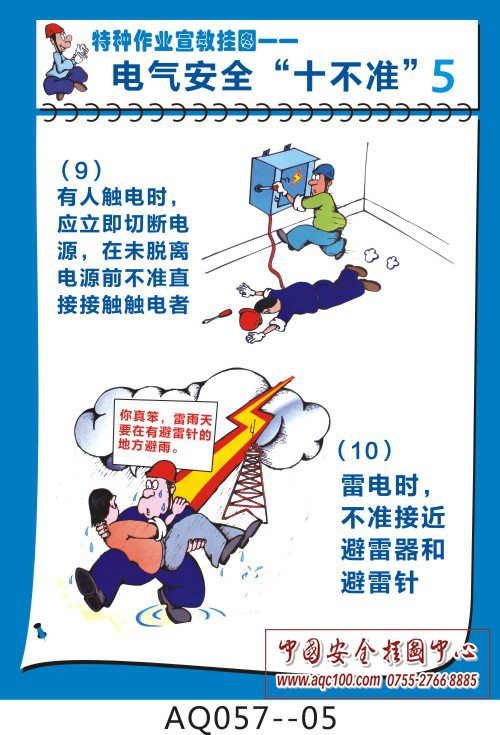 AQ057-05 有人触电时,应立即切断电源,在未脱离电源前不准直接接触触电者,雷电时,不准接近避雷器和避雷针