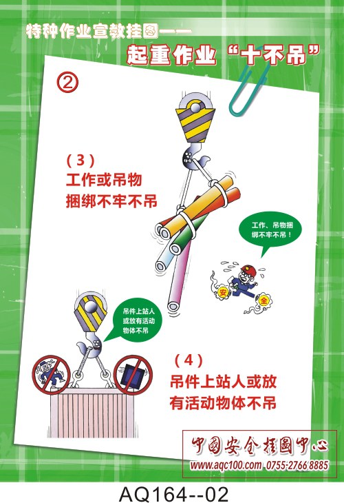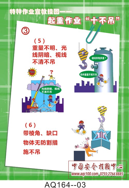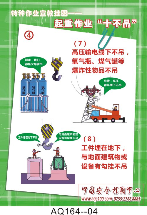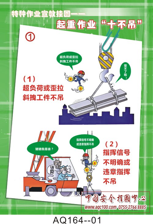本套起重作业“十不吊”挂图对起重作业中必须禁止的行为及因此造成的严重后果用漫画加以演绎,帮助起重作业人员正确识别潜在危险,牢记安全规程。能起到很好的宣传警示作用。