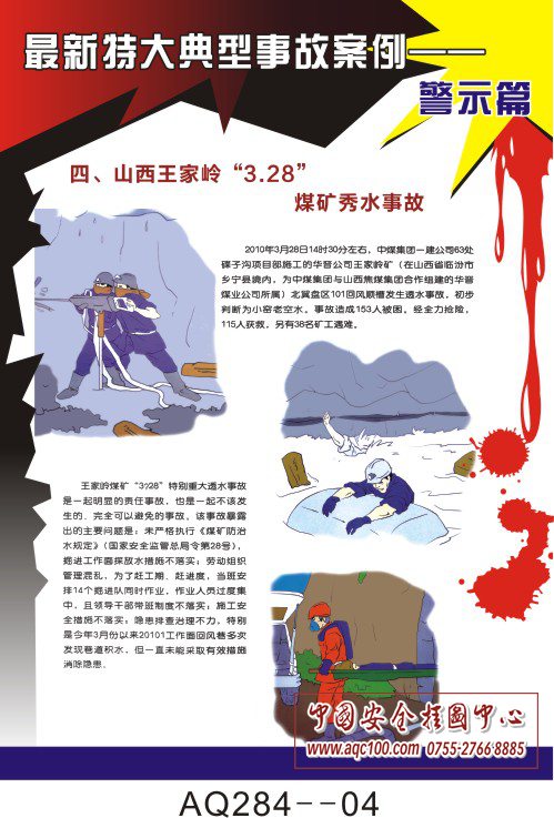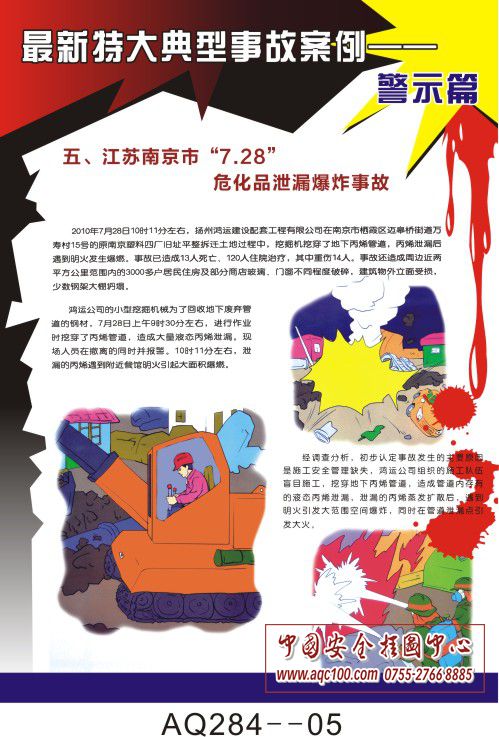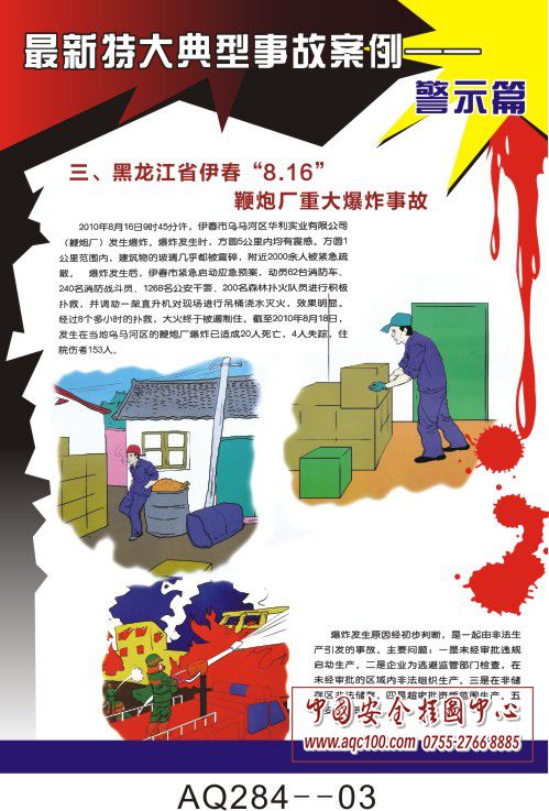 AQ284-01 辽宁省阜新市“5.23”特别重大道路交通事故 AQ284-02 河南省洛阳市“3.31”特别重大煤与瓦斯事故 AQ284-03 黑龙江省伊春“8.16”鞭炮厂重大爆炸事故 AQ284-04 山西王家岭“3.28”煤矿秀水事故 AQ284-05 江苏南京市“7.28”危化品泄漏爆炸事故