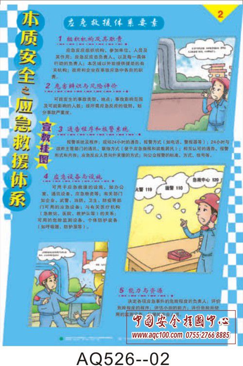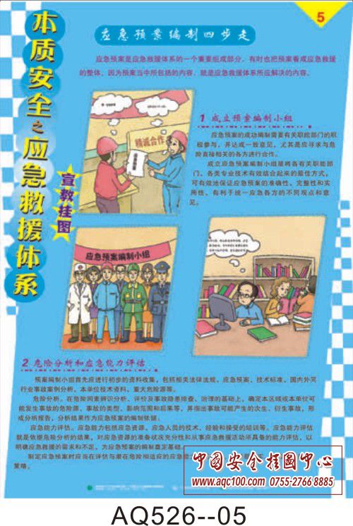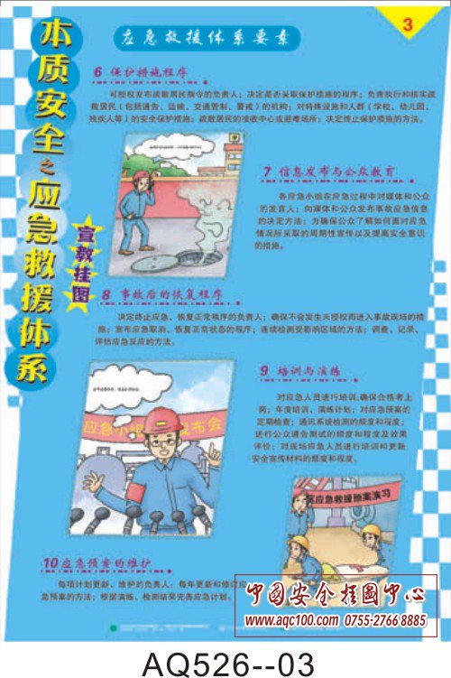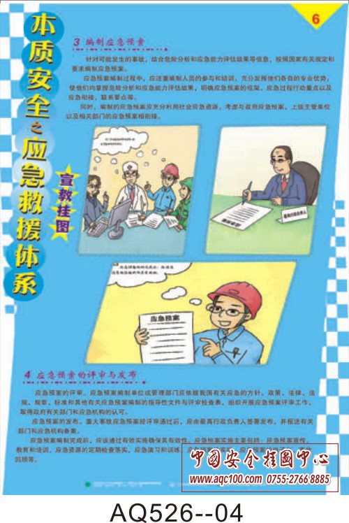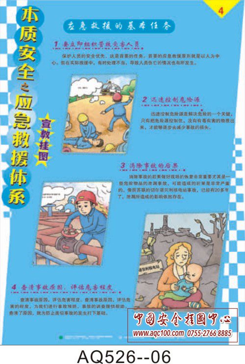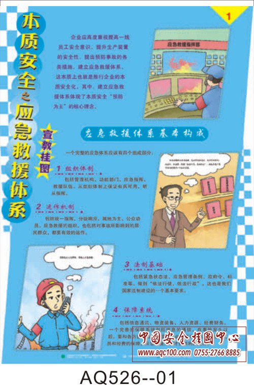 AQ526-01本质安全之应急救援体系挂图 应急救援体系基本构成 AQ526-02本质安全之应急救援体系挂图 应急救援体系要素 AQ526-03本质安全之应急救援体系挂图 应急救援体系要素 AQ526-04本质安全之应急救援体系挂图 应急救援的基本任务 AQ526-05本质安全之应急救援体系挂图 应急预案编制四步走 AQ526-06本质安全之应急救援体系挂图 编制应急预案、应急预案的评审与发布