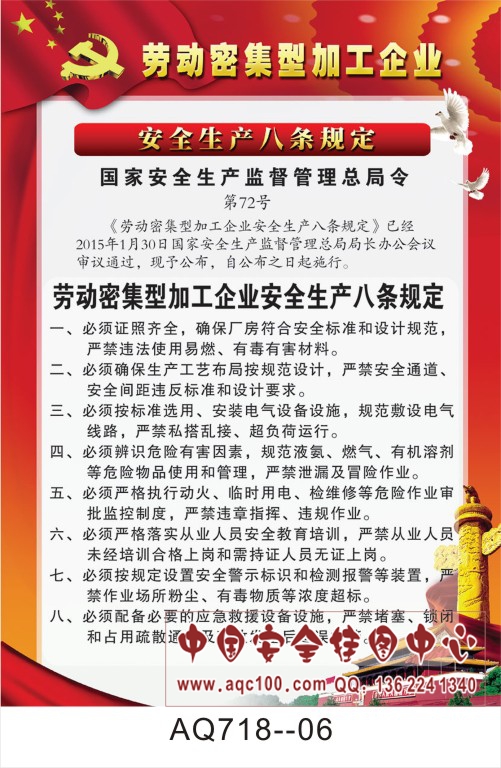 AQ718-06-2016年安全生产月依法治安构建和谐主题宣传挂图 劳动密集型加工企业安全生产八条规定