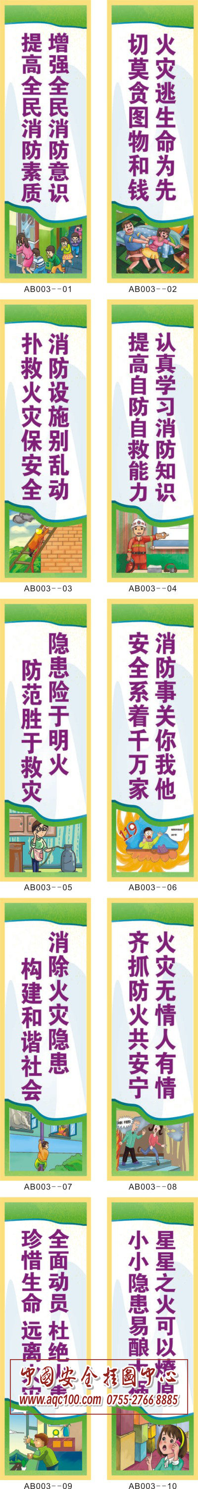 AB003-01消防安全宣传标语 增强全民消防意思 提高全民消防素质 AB003-02消防安全宣传标语 火灾逃生命为先 切莫贪图物和钱 AB003-03消防安全宣传标语 消防设施别乱动 扑救火灾保安全 AB003-04消防安全宣传标语 认真学习消防知识 提高自防自救能力 AB003-05消防安全宣传标语 隐患险于明火 防范胜于救灾
