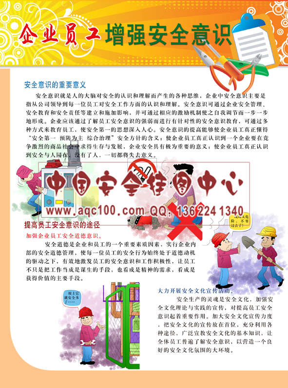 企业员工增强安全意识宣传单是专为“安全生产月”活动宣传而制作的,将安全知识和国家的政策进行系统的融合,涉及的知识包括各行业日常安全内容,贴近百姓生活,实用性强。适合安全生产月活动期间宣传和发放,也可供安监局在安全咨询日发放和企业员工的常识教育。