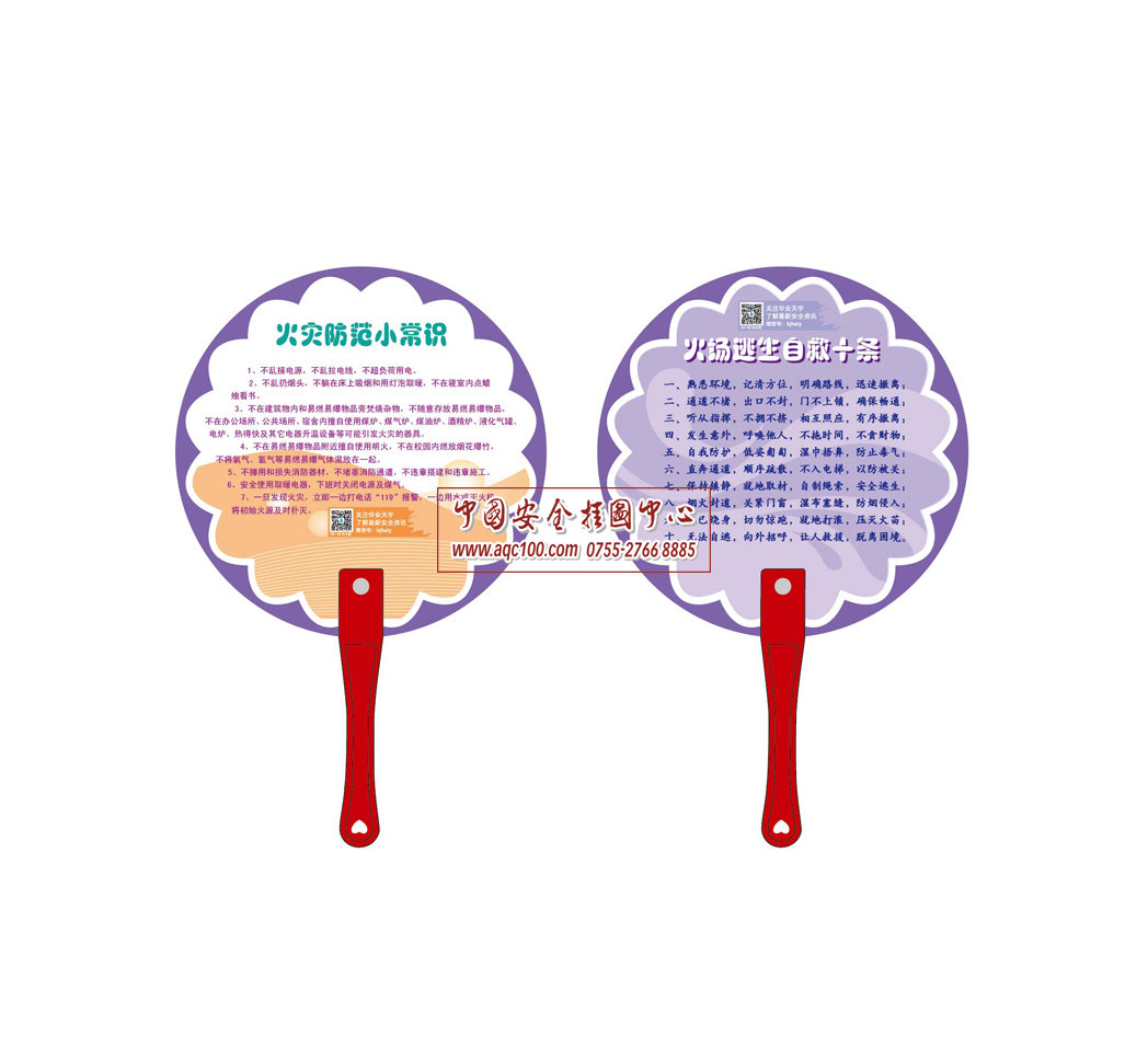 本公司推出的安全扇系列包括七折扇与手柄扇,坚固耐用,图文并茂,知识点丰富,旨在普及安全生产知识,提高人民群众安全生产意识。本产品可用于咨询活动时派发,一方面活跃了活动氛围,促进互动、引人入胜;另一方面,印有安全字样的礼品伴随着群众日常生产生活,将潜移默化起到提醒作用,将安全生产意识延深到每天的生活中。