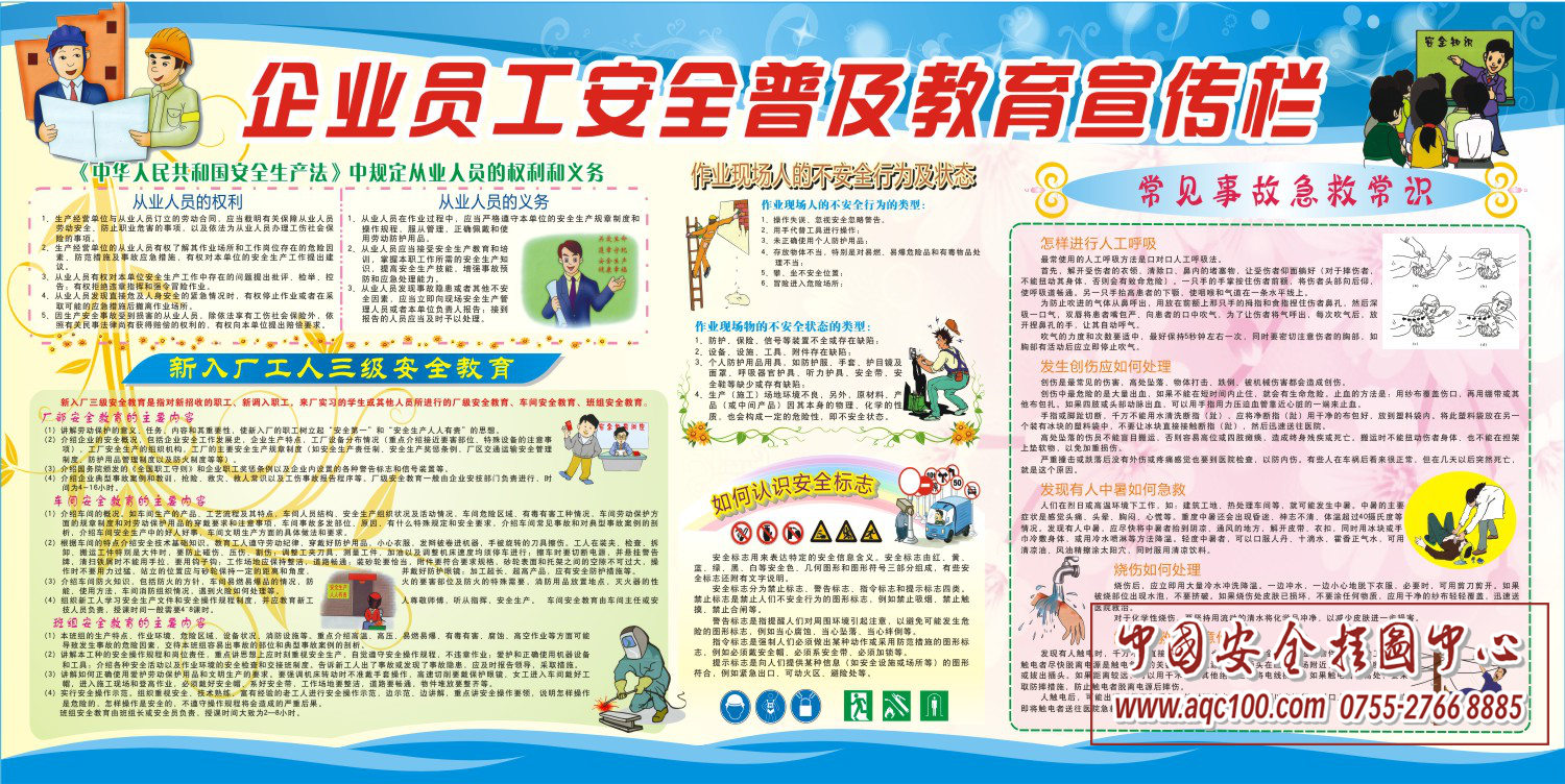 产品简介:企业员工安全普及教育宣传栏-包含从业人员的权利和义务、新入厂工人三级安全教育、作业现场的不安全行为、如何认识安全标志、常见的事故急救常识。