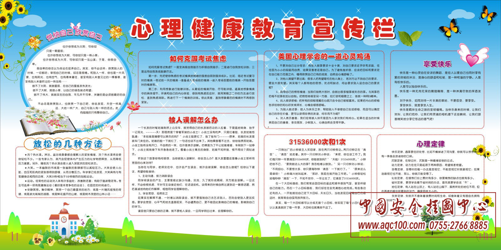 校园青少年心理健康宣传栏主要针对学校的学生在校园生活一个成长过程中有可能产生一些不健康的心理,让学生如何克服所产生的误会、考试的焦虑等