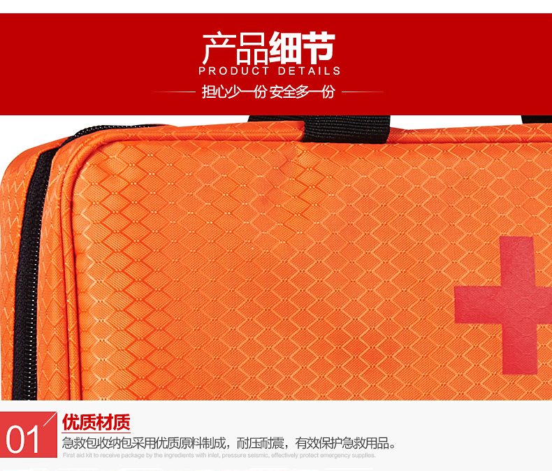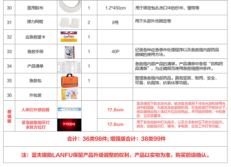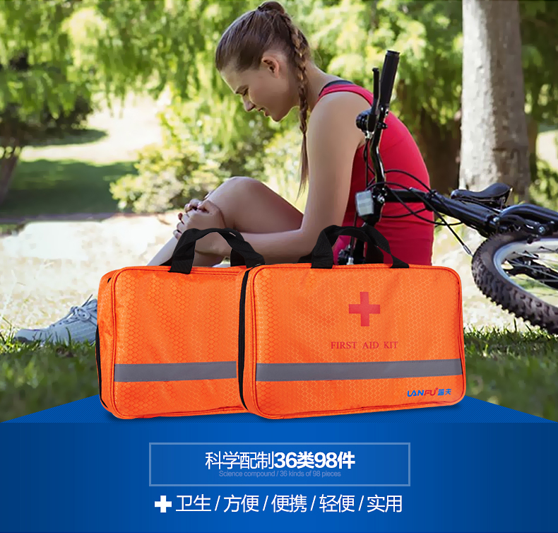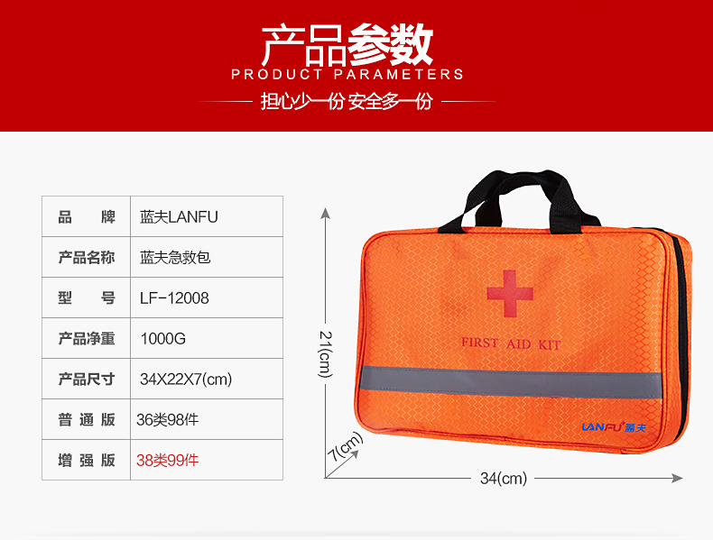 产品简介:彩盒包装 急救包-牛津布-蓝夫LF-12008 36类98件; 增强版合计:38类99件,如需增强版价格248元