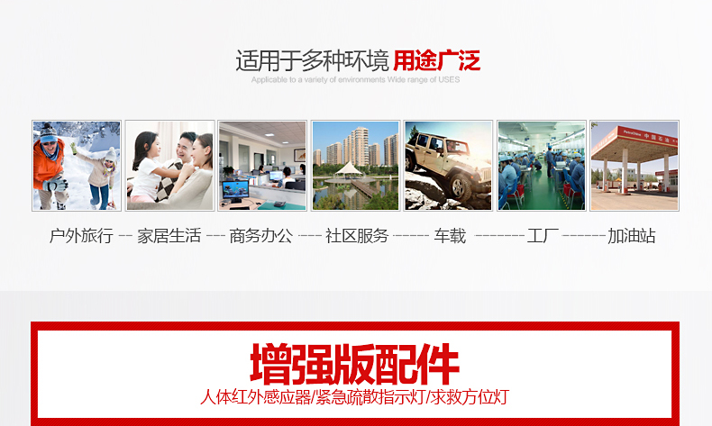用途:紧急情况下的主动光源,解决紧急情况下寻找光源和使用光源中的困难,为紧急急救赢取时间。在急救箱打开的状态下,感应器感应到人体红外后自动亮起。并可磁铁吸附、卡扣悬挂、立式放置等, |