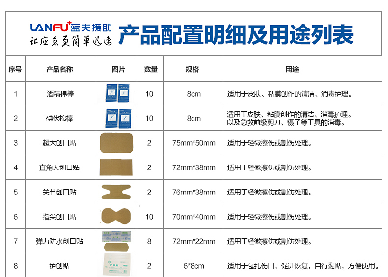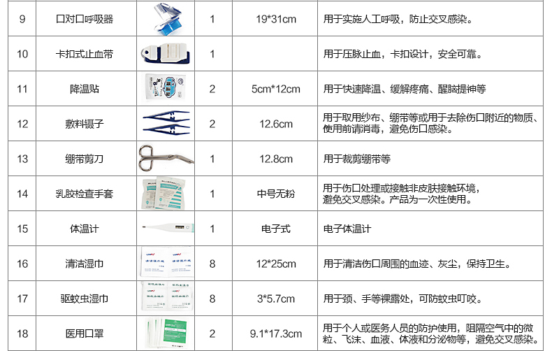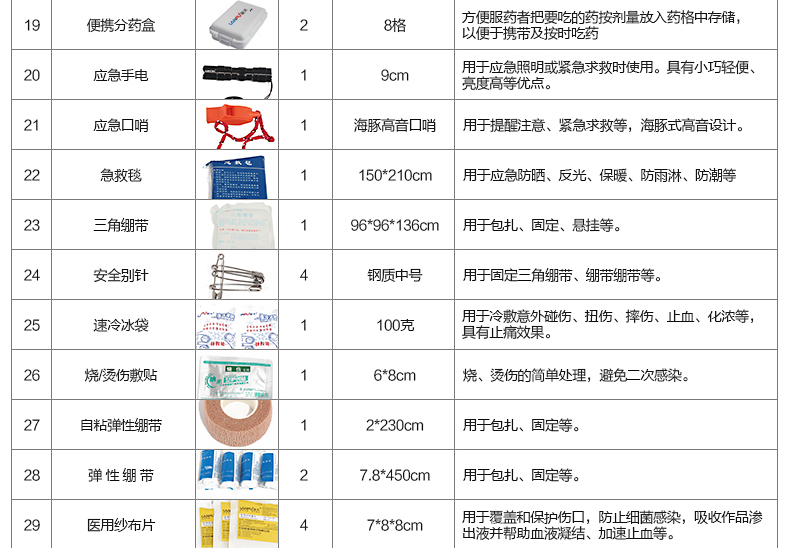 用途:急救箱内部产品的清单。产品清单中备有“自购药品清单”,为正确规范使用急救箱提供条件。 |