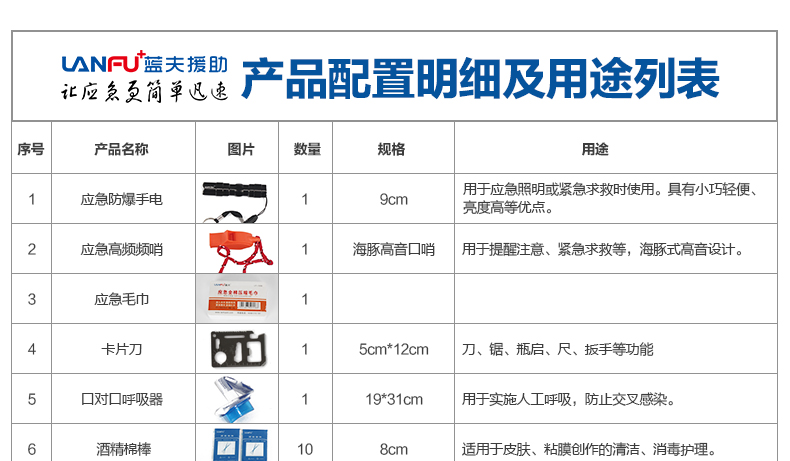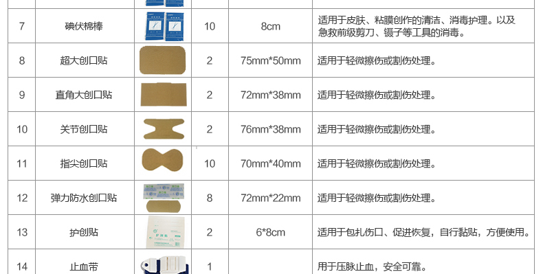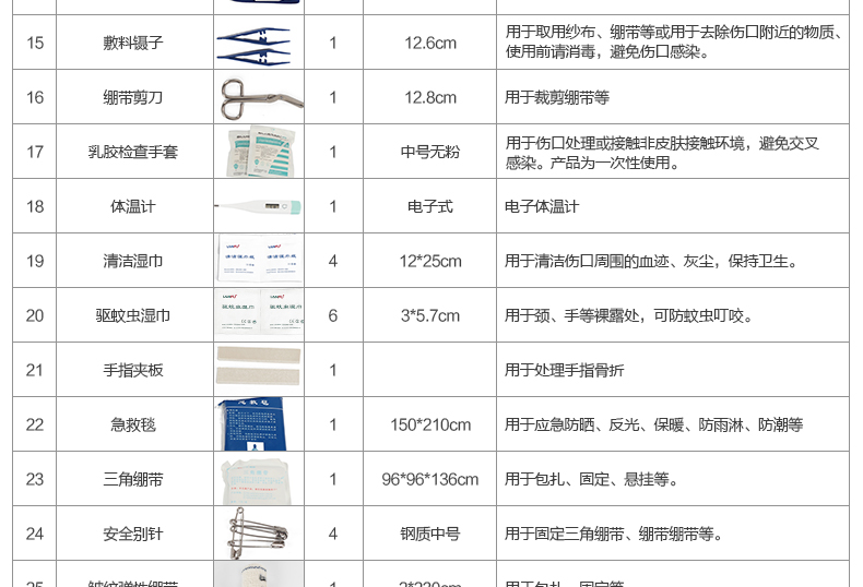 用途:急救箱内部产品的清单。产品清单中备有“自购药品清单”,为正确规范使用急救箱提供条件。 |