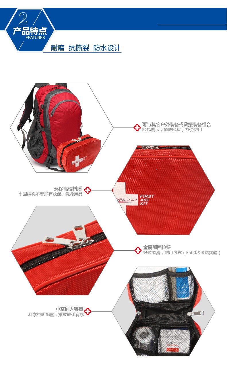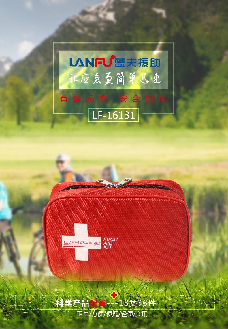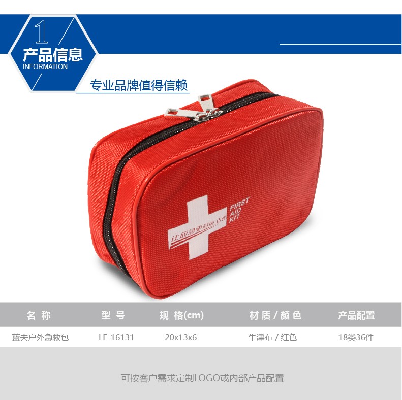产品简介:急救包LF-16131 内置18类36件 牛津布防水,轻巧便捷,卫生方便实用