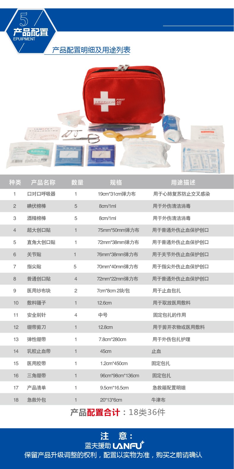 | 急救包LF-16131配置清单 | | 种类 | 产品名称 | 数 量 | 规 格 | 用途描述 | | 1 | 口对口呼吸器 | 1 | 19cm*31cm | 用于心肺复苏防止交叉感染 | | 2 | 碘伏棉棒 | 5 | 8cm/1ml | 用于外伤清洁消毒 | | 3 | 酒精棉棒 | 5 | 8cm/1ml | 用于外伤清洁消毒 | | 4 | 超大创口贴 | 1 | 75mm*50mm弹力布 | 用于普通外伤止血保护创口 | | 5 | 直角大创口贴 | 1 | 72mm*38mm弹力布 | 用于普通外伤止血保护创口 | | 6 | 关节贴 | 1 | 76mm*38mm弹力布 | 用于关节外伤止血保护创口 | | 7 | 指尖贴 | 5 | 70mm*40mm弹力布 | 用于指尖外伤止血保护创口 | | 8 | 普通创口贴 | 4 | 72mm*22mm弹力布 | 用于普通外伤止血保护创口 | | 9 | 医用纱布块 | 1 | 7cm*8cm 2块/包 | 用于止血包扎 | | 10 | 敷料镊子 | 1 | 12.6cm | 用于取放医用敷料 | | 11 | 安全别针 | 4 | 中号 | 固定包扎的作用 | | 12 | 绷带剪刀 | 1 | 12.8cm | 用于剪开衣物或医用敷料 | | 13 | 弹性绷带 | 1 | 7.8cm*280cm | 用于外伤包扎护理 | | 14 | 医用胶带 | 1 | 1.2cm*450cm | 固定包扎 | | 15 | 乳胶止血带 | 1 | 45cm | 止血 | | 16 | 三角绷带 | 1 | 96cm*98cm*136cm | 固定包扎 | | 17 | 产品清单 | 1 | 9.5cm*16.5cm | 急救箱配置明细 | | 18 | 急救外包 | 1 | 20cm*13cm*6cm | 牛津布 | | 合计:18类36件 |