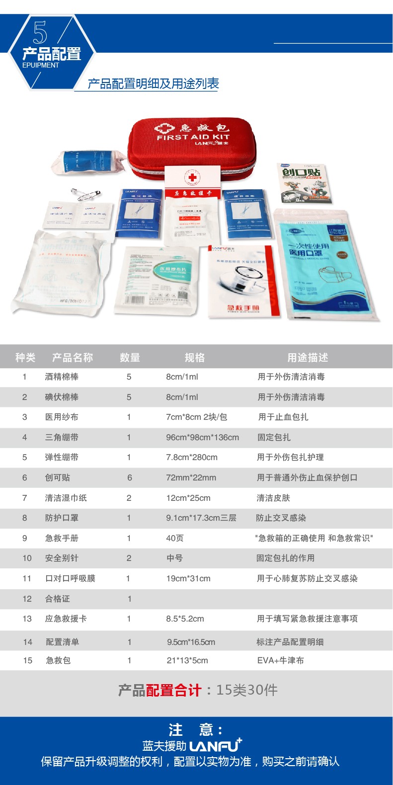 | 蓝夫急救包LF-16132配置清单 | | 序号 | 产品名称 | 数量 | 规格 | 用途描述 | | 1 | 酒精棉棒 | 5 | 8cm/1ml | 用于外伤清洁消毒 | | 2 | 碘伏棉棒 | 5 | 8cm/1ml | 用于外伤清洁消毒 | | 3 | 医用纱布 | 1 | 7cm*8cm 2块/包 | 用于止血包扎 | | 4 | 三角绷带 | 1 | 96cm*98cm*136cm | 固定包扎 | | 5 | 弹性绷带 | 1 | 7.8cm*280cm | 用于外伤包扎护理 | | 6 | 创可贴 | 6 | 72mm*22mm | 用于普通外伤止血保护创口 | | 7 | 清洁湿巾纸 | 2 | 12cm*25cm | 清洁皮肤 | | 8 | 防护口罩 | 1 | 9.1cm*17.3cm三层 | 防止交叉感染 | | 9 | 急救手册 | 1 | 40页 | 急救箱的正确使用 和急救常识 | | 10 | 安全别针 | 2 | 中号 | 固定包扎的作用 | | 11 | 口对口呼吸膜 | 1 | 19cm*31cm | 用于心肺复苏防止交叉感染 | | 12 | 合格证 | 1 |
